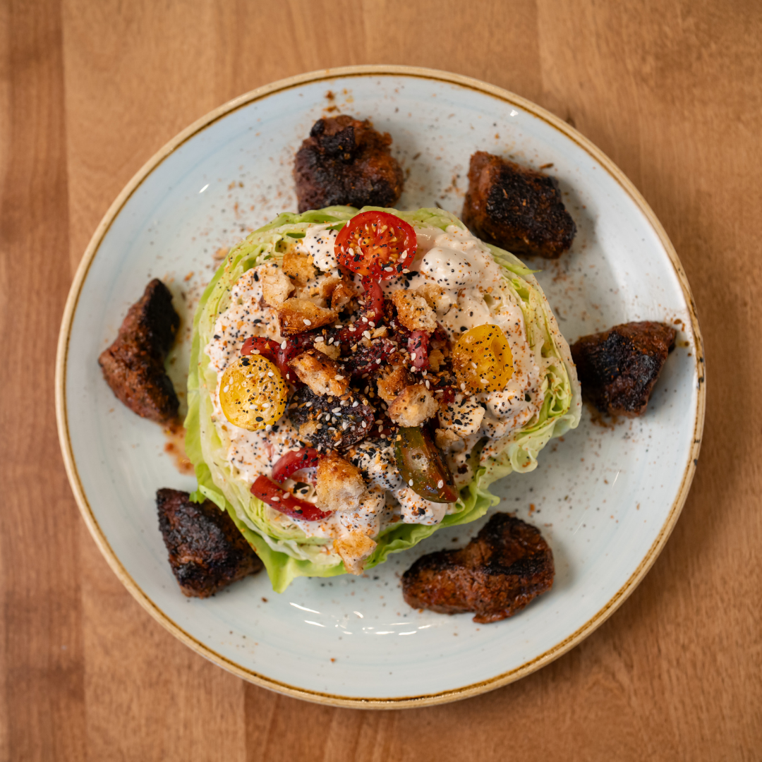 Blackened Steak Tips, Iceberg Lettuce, Cherry Tomatoes, Pickled Red Onions, Chunky Blue, Cheese Dressing, Everything Bagel Crunch