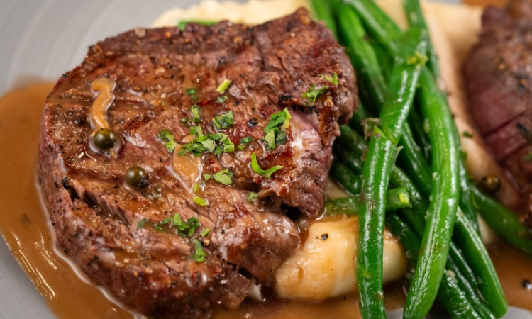 9 ounce grilled, Yukon Gold Mashed Potatoes, Green Beans, Brandy Peppercorn Sauce