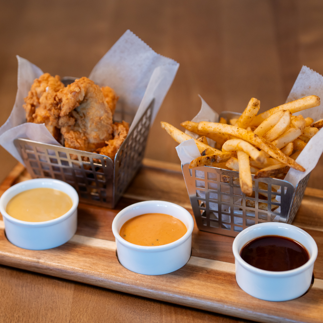 (7) 2oz chicken tenders , GF Flour tossed (oat, corn, and chickpea flour), French Fries, Trio of Dipping Sauces (BBQ, Honey Mustard, Comeback Sauce)