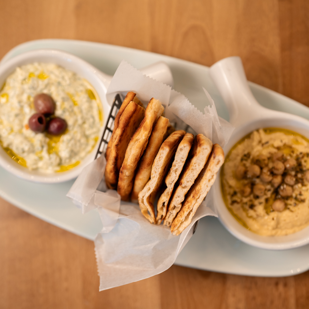 Chickpea Hummus, Dill & Cucumber Tzatziki, Grilled Fresh Pita