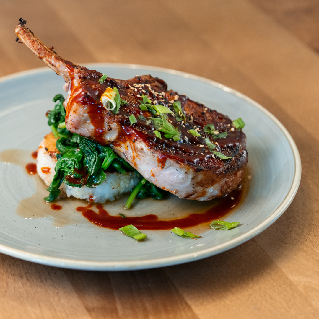 Crispy Rice Cake, Sesame Spinach, Asian BBQ