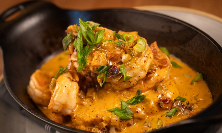 Crispy Cheesy Grit Cake, Holy Trinity, Black Pepper Bacon, Sherry Creole Cream