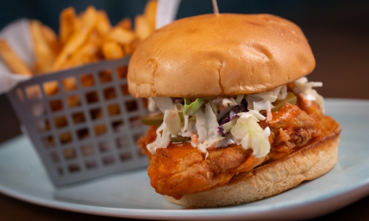 GF Breading (oat, corn, chickpea flour), Buffalo Hot, Carrot & Celery Blue Cheese Slaw, Pickles